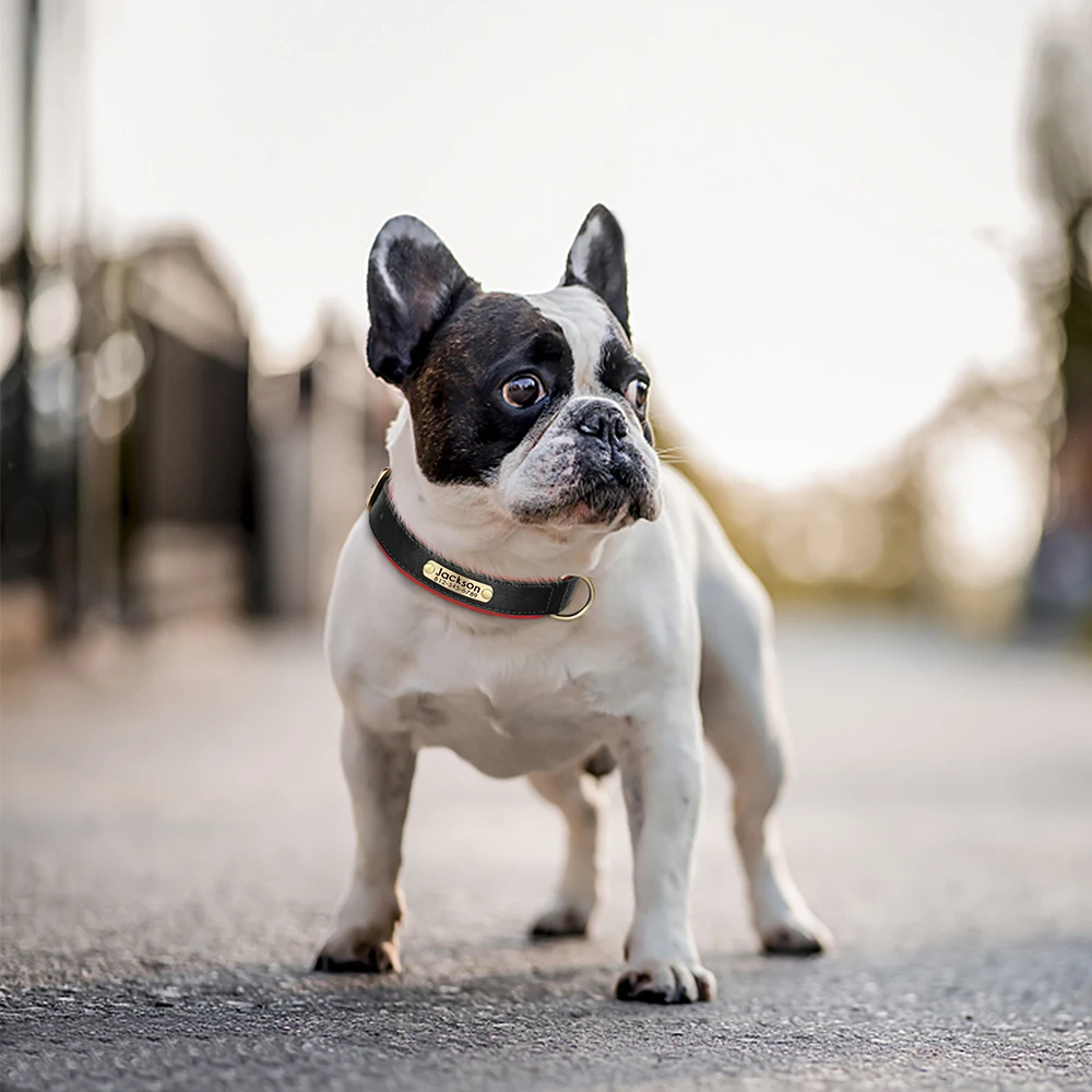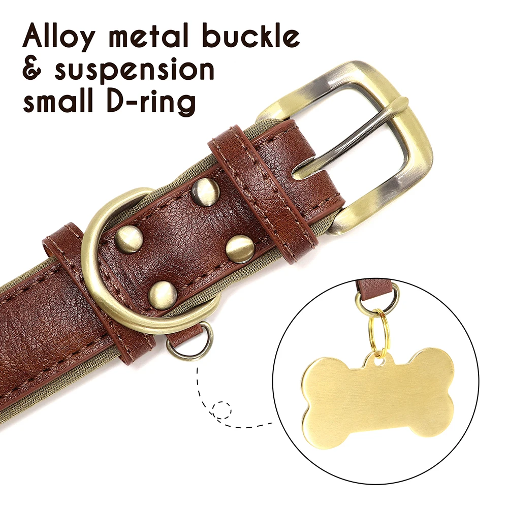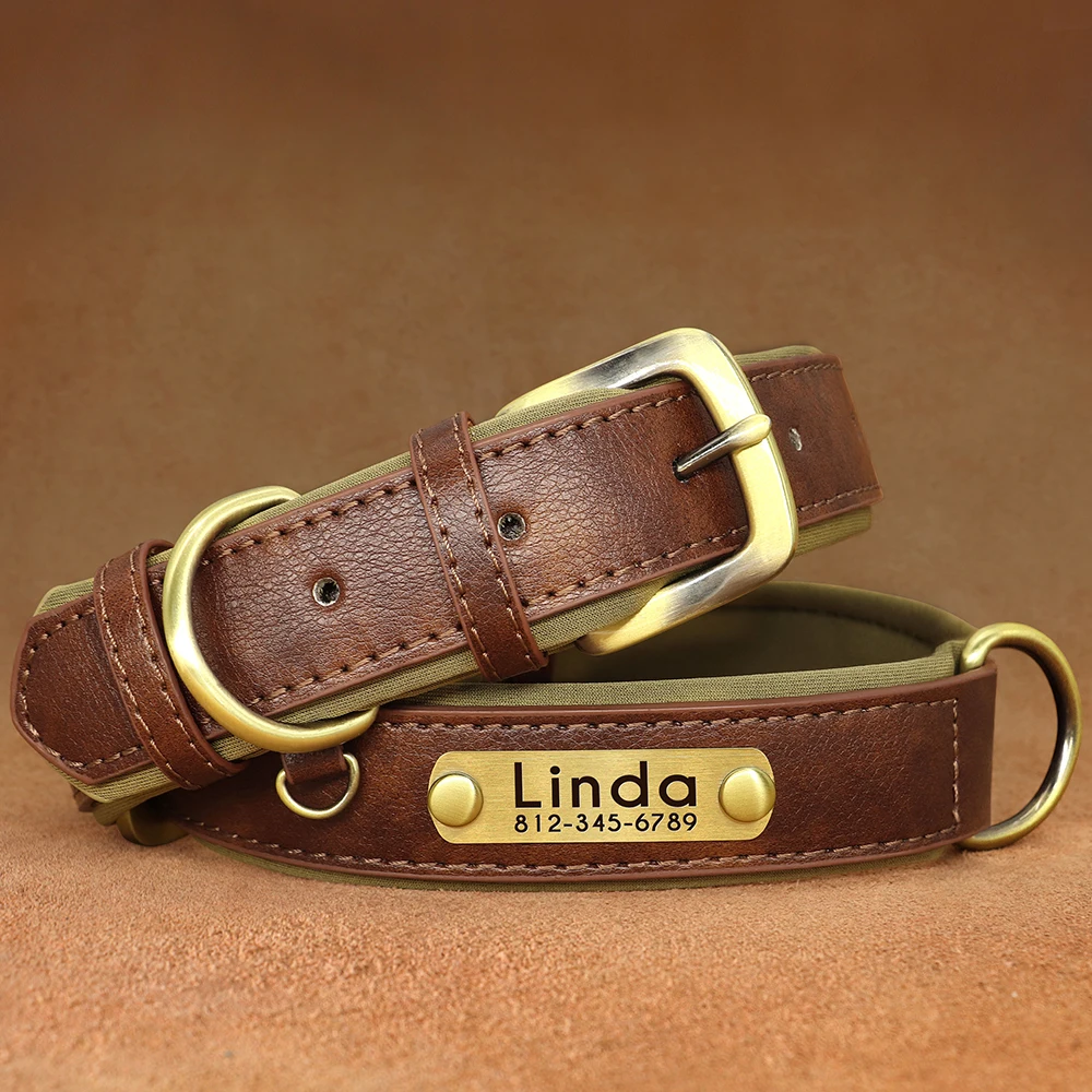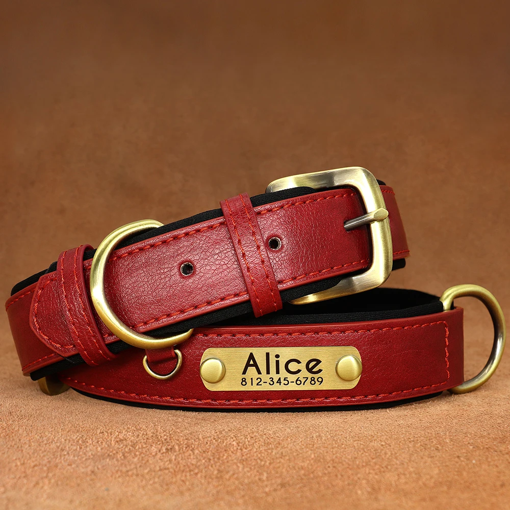 Coleira de identificação de couro pu personalizada, coleira de cachorro macia e acolchoada, gravação gratuita, nome para cães pequenos, médios e grandes, ajustável